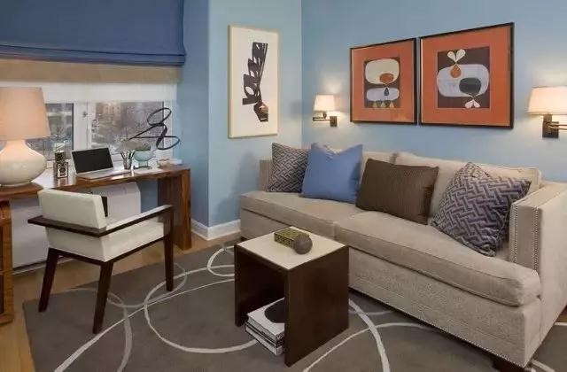 蓝色背景墙+蓝色沙发营造视觉的统一性。