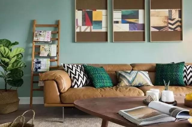 孔雀绿背景墙+褐色沙发营造自然轻松的空间氛围。