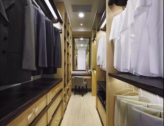 为提高衣帽间使用效率,应该做好功能分类,采用合理的设计来勾勒出悬挂区、叠放区、杂物区和大件区等专用储藏空间,使每个角落都得到充分利用,才是理想的衣帽间类型。