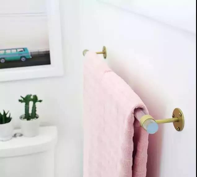 ▲浴室中使用窗帘杆的另一个小妙招是建一个毛巾架,比挂钩看起来更有质感,将透明杆与支架组合起来,有一种混搭美,根据需要想DIY几个都可以。
