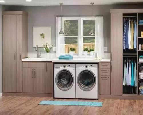 在设计一个家庭一站式洗衣间时,首要事情就是选择合适的位置,通常,家里有地下室的小伙伴可能会将地下室改为洗衣房。其他的或是选在卫生间旁边,这样洗完澡就可以直接把衣物扔进洗衣机清洗,省时省力;或是把洗衣间装在厨房和阳台。洗衣间采光好也是很重要的,若是在阳面的话晾晒也可以一步解决。