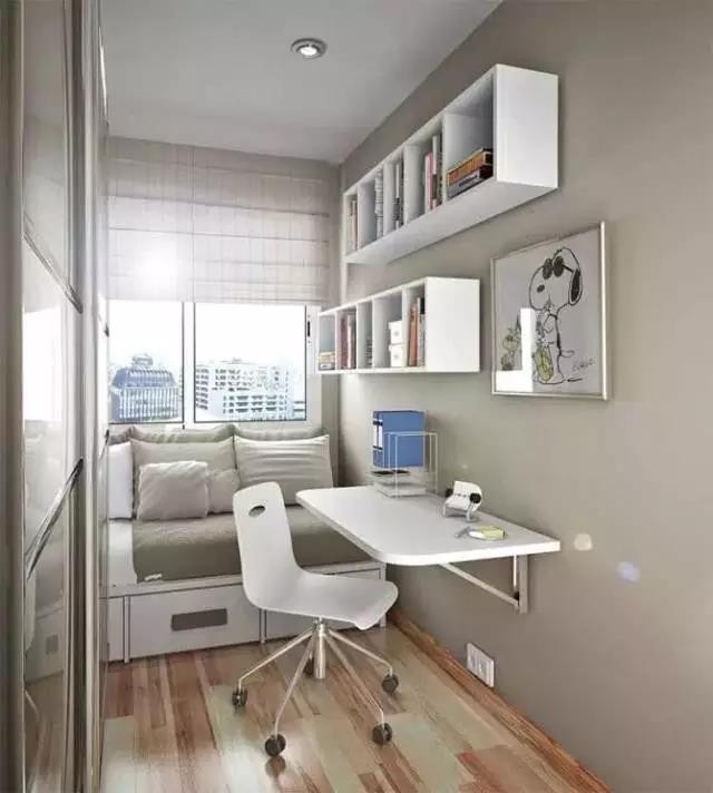绝对没有地方摆下一张办公桌?没关系,只要你还能摆上一张床。对于十几二十平的小空间来说,阁楼床无疑是最好的选择。只要一小片空间,睡觉,办公,收纳都能一次性解决。下床后就可以穿上睡衣安静的办公。