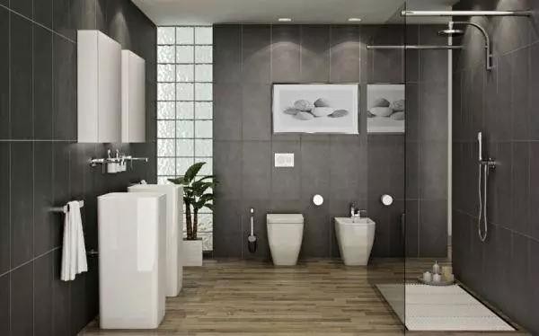 大多数五星级酒店追求大气简约的质感,因而配色选纯色的、深色的较多。同时由于卫生间水分大,人来人往,做成深色非常耐脏.而一般家居卫生间选择深色多以灰色为主,既不会过于沉闷又看起来十分高档。