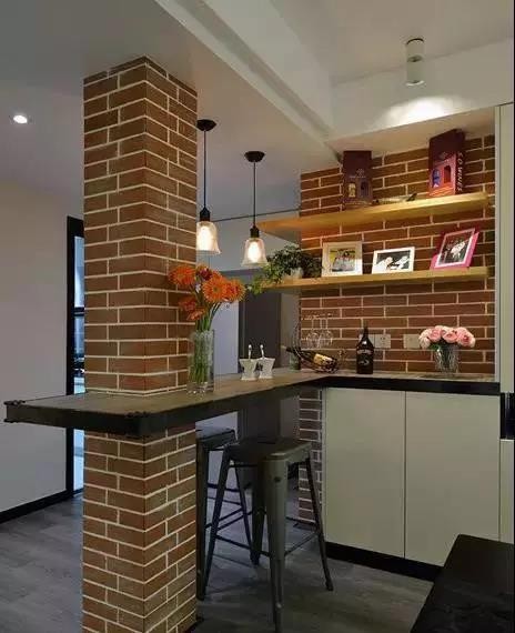#设计感# 家里沿墙的吧台设计,可以用吧台设计代替休闲区,让狭长的家居空间多了一份设计感,还能节省不少空间呢。