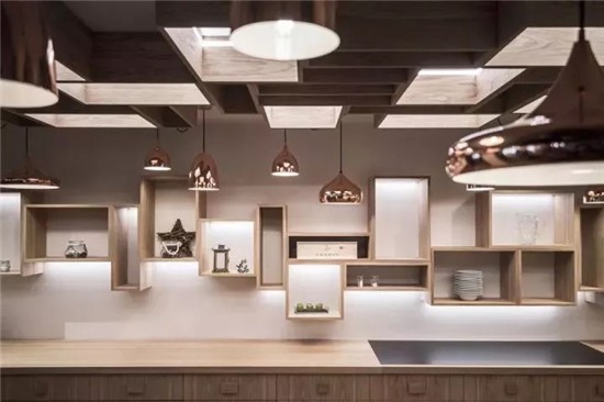 不同灰度的粉色摆放在通透的就餐环境之中,让人的视线聚焦在空间中央的吊灯上。在同色调座椅和房顶的映衬下,展现出低调的优雅。