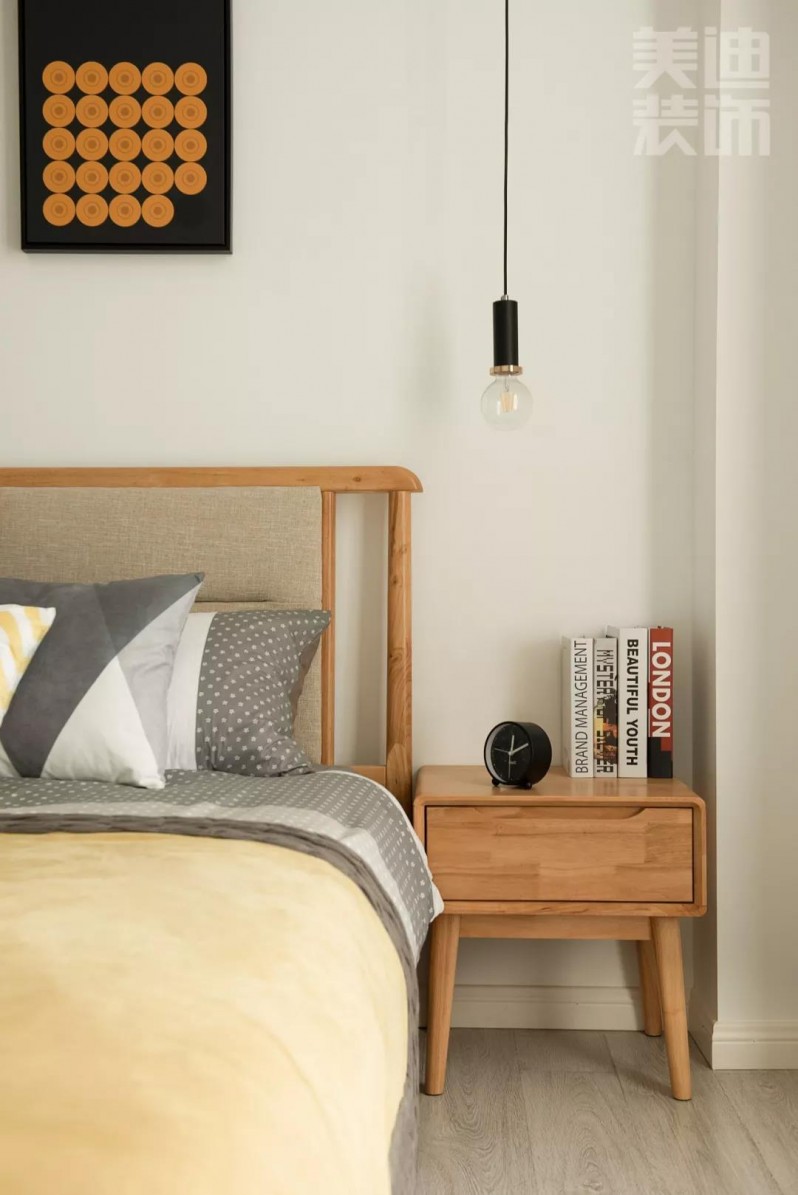 卧室延续了简约的布置风格,床头只有一张原木色小边几,原木床与衣柜的组合简洁实用,空间没有多余的装饰,但完全满足两人的基本使用需求。