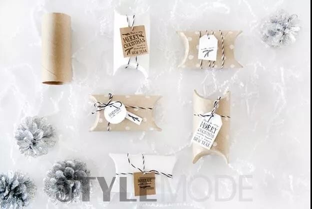 材料:厕纸芯筒、礼物包装纸、双面胶、细麻绳