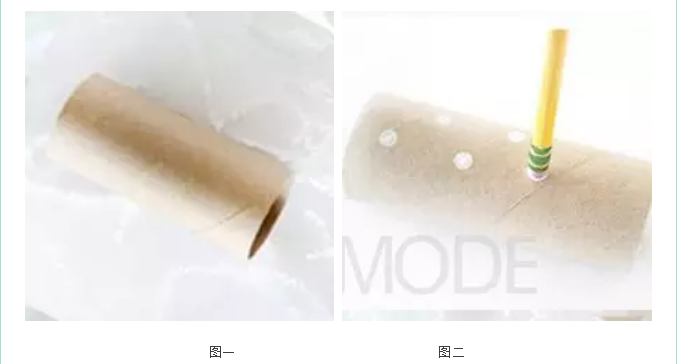 撕掉芯筒外层的白纸,会暴露出牛皮纸面(图一);接着使用铅笔的末端沾上颜料(图二),颜色选择自己喜欢的即可,小美个人推荐使用指甲油,因为容易上色且不容易掉。