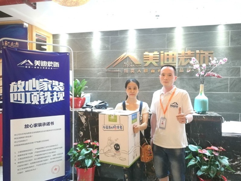 上图为人气工地评选获得一等奖的业主江女士和项目经理李胜利的领奖合照,莱迪智能桌面机器人很萌有没有?江女士还说孩子肯定很喜欢它,要早早把它带回家呢。