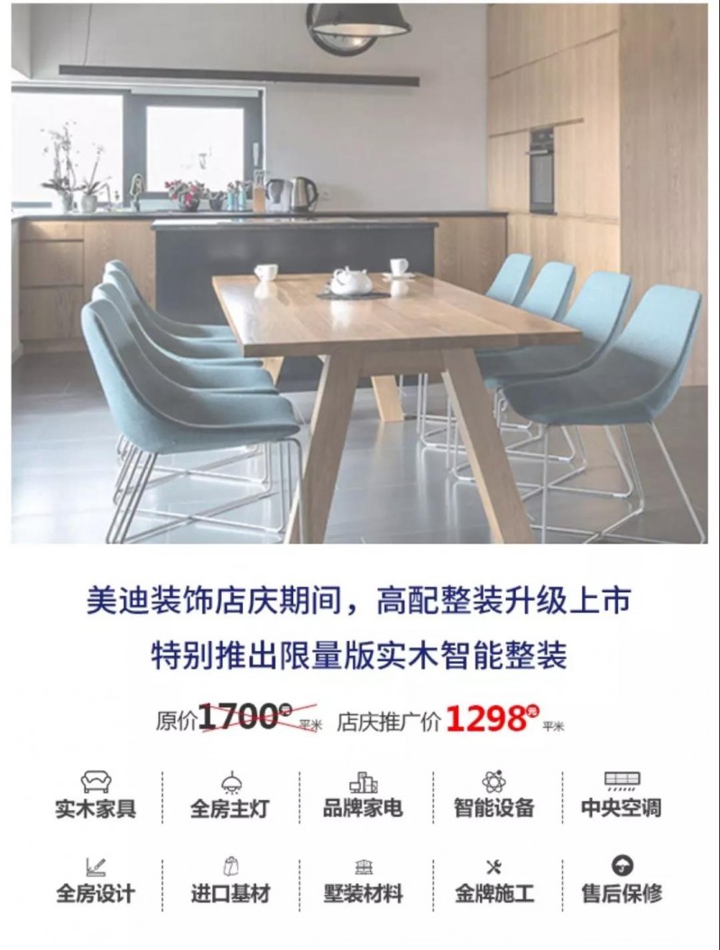 原价1700元/平米,店庆限时推广价1298元/平米,全系墅装主材+全系进口基材+全系生态实木免费升级+全房品牌家电大赠送+全房品牌家具大赠送+智能设备免费送。