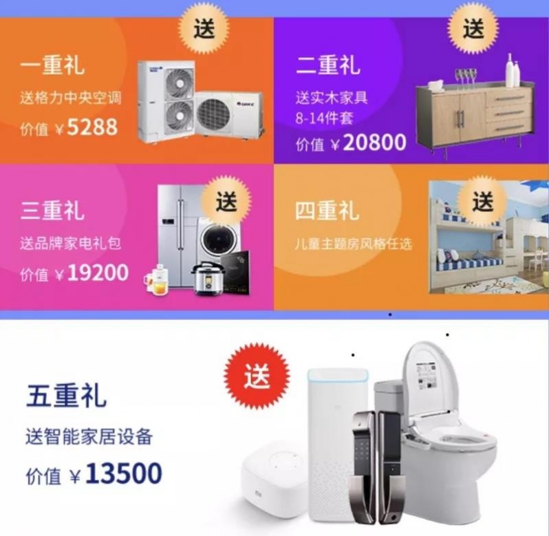 格力中央空调、8-14件套实木家具、品牌家电礼包、智能家居设备、儿童房;五重好礼,总有一款让你心动。