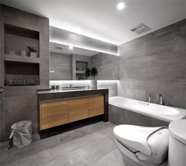 2、虽然灰色和黑色显得神秘、高级,但是颜色把控不好的话,卫生间会显得昏暗潮湿。所以在卫生间灯光的配合上需要注意下,比如可以用筒灯、镜前灯、灯带等综合配光;
