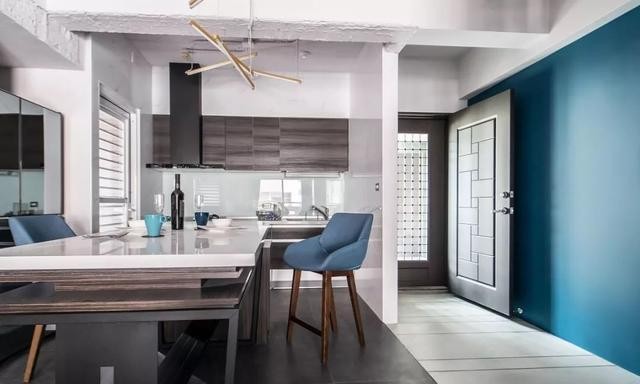 推开门,印入我们眼帘的就是左边大片的蓝墙,和脚下的白色地砖,这蓝和白的结合,让人不期然地想到了蓝天白云,这样的设计给整个家居空间带来几分清爽的气息。