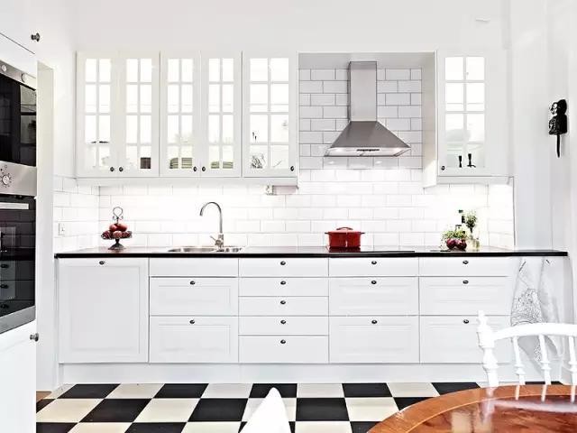 厨房的白色大门简洁明亮,推门而入踩着黑白格子的地板,白色椅子围绕深色实木圆桌,避开完全的纯白,体现强烈的对比度。