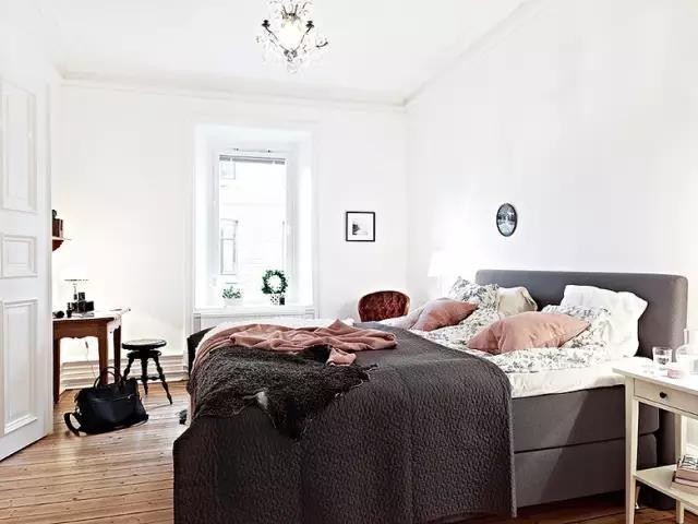 卧室正中摆放一张简约双人床,角落一张实木梳妆台,卧室的主体结构仅此而已,简约就是这样。
