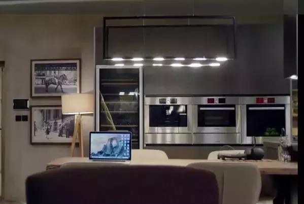 厨房里的一整套橱柜非常高大上,金属质感搭配水泥墙面背景,有种美式工业风格的味道。