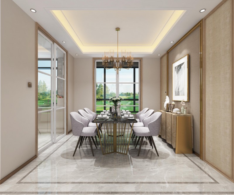 餐厅选用禅意的现代风餐桌椅,同时靠墙装了个入墙式的餐边柜,整个空间简洁而又舒适高档;
