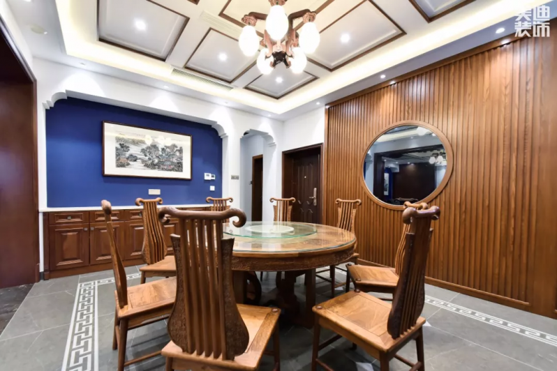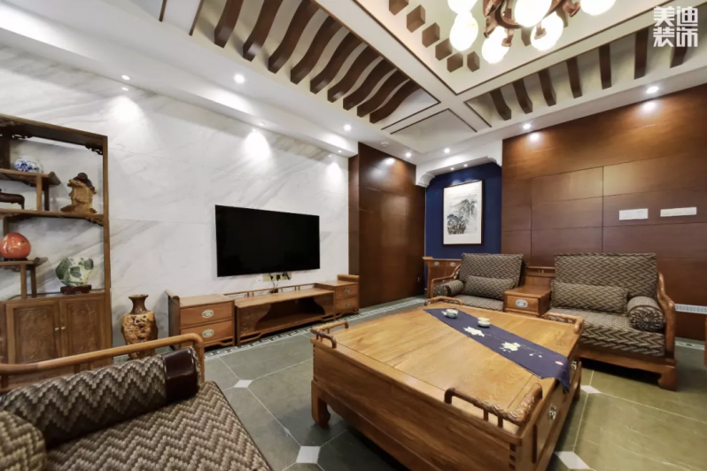 墙面运用的是中国风如意回纹造型,再挂上一副山水画,充满诗意的场景油然而生。