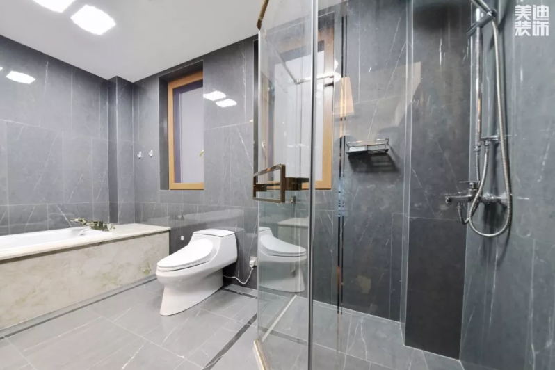 卫生间采用高级灰色调,整个空间明亮简洁,墙面砖采用错拼的方式,使空间更具层次感。