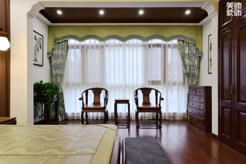 明式家具也在卧室中充分绽放出它的魅力,原木色家具配上亮色窗帘和绿植,空间沉稳中又不失灵气,更彰显出原木色的高贵与优雅。