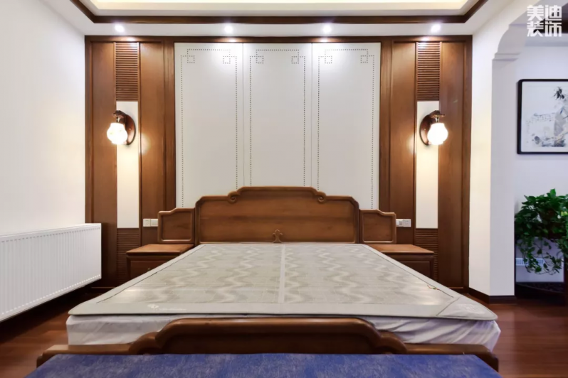 主卧的设计也延用原木色和中国风回纹设计,床头背景同样是深浅色对此,但这给人更多的是恬静温馨之感。