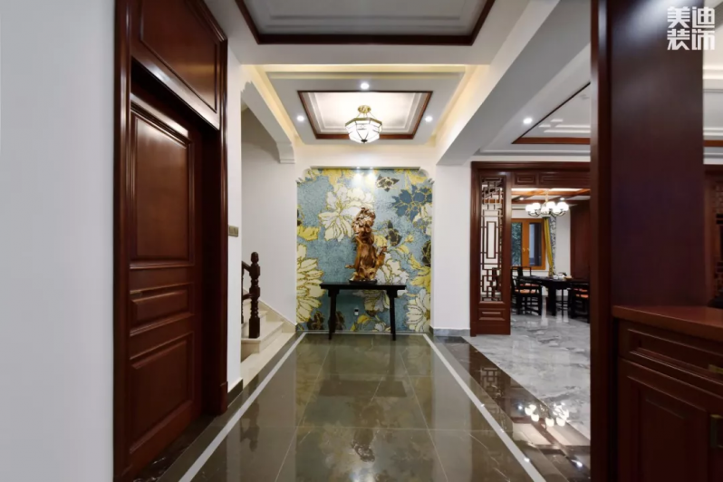 步入玄关,一尊牙伯雕塑映入眼帘,那静默的姿态与墙上的花开富贵图相映衬,使自然情怀无声流露,意境悠远。