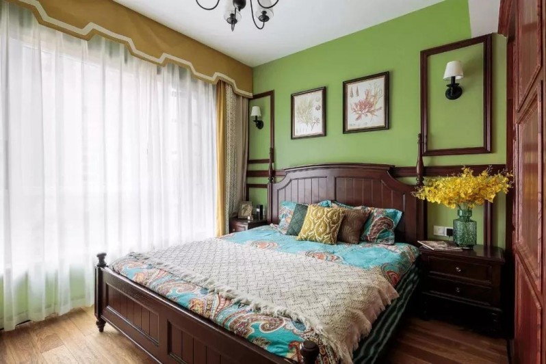 主卧延续森林绿的床背景,深木画框与装饰画点缀造型。
