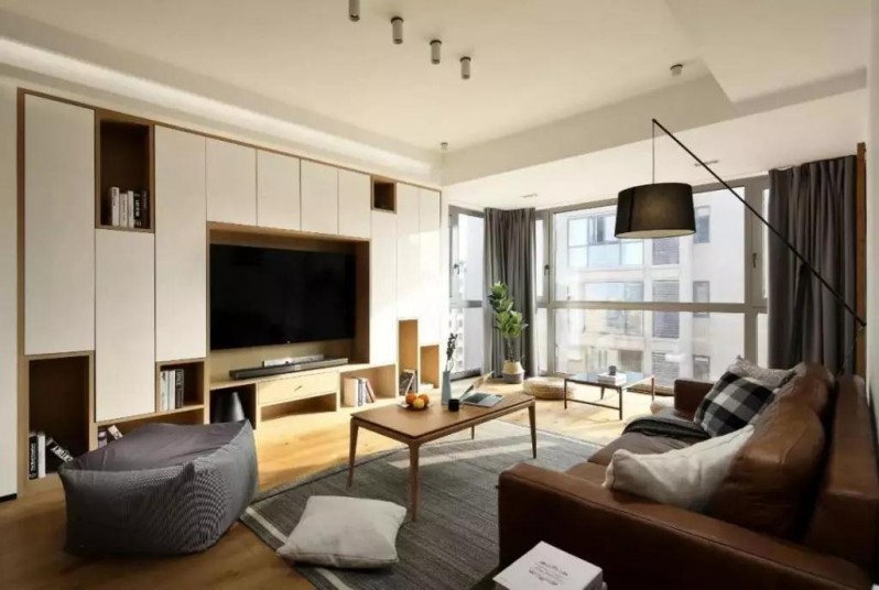客厅的空间很宽敞,电视背景墙做了一整满墙的原木收纳柜,中间留出空间挂电视,简约又实用。沙发背景墙是简单的大白墙,搭配了深咖色的沙发,还有原木的茶几,看起来很温暖舒适,而且客厅靠近窗子,采光效果超级好,整个空间看起来都很温暖干净。