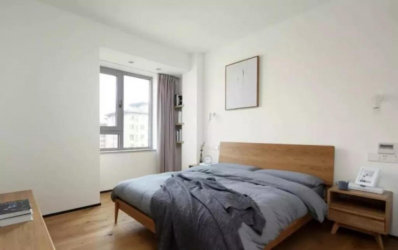 主卧布置也很简单,全屋都是大白墙,地面是木地板,还在床头挂一副简单的挂画,浅木色的床搭配灰色的床铺,整个空间都很简约舒适,也很有品味。