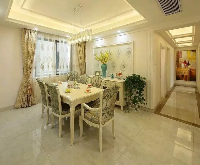 餐厅与客厅没有明显划分,色调延续了客厅的主调,同样的背景墙纸加上同样的窗帘,连家具都是跟客厅配套的。一致的风格才能让整个空间更具整体性。窗帘与家具都是业主专门订做的,花费了女主人不少心力。