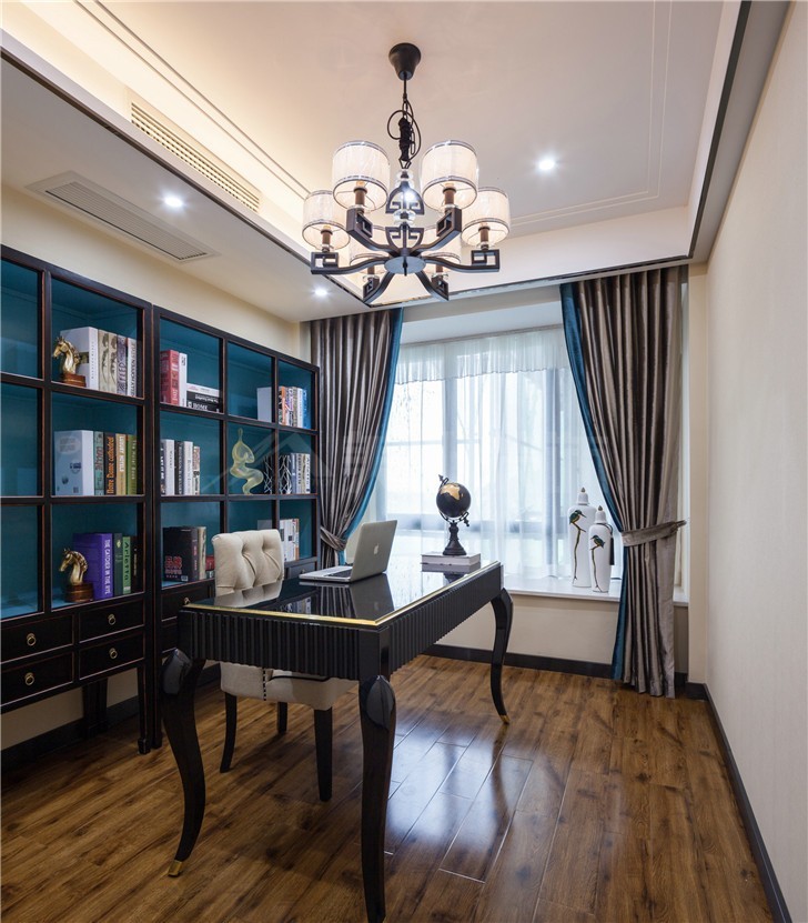 书房是日常学习的地方,宜选用冷色调为主,有利于营造学习氛围。悬挂的字画以柔和为主。书房的墙壁和房顶宜选用淡蓝色或白色,地面宜选用浅黄色地板。