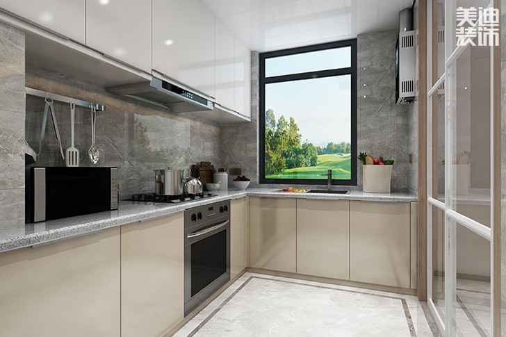 厨房应给人整洁、干净的感觉。厨房墙面宜选用白、灰色瓷砖,更有利于清洁,地面宜选用耐污染力强的色彩。厨房的顶部宜选用浅灰色、浅黄。