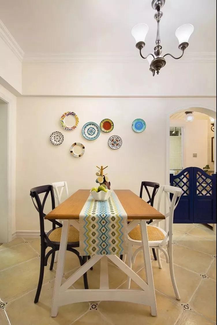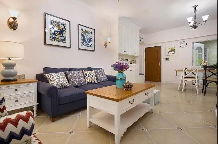 蓝色的沙发和一些蓝色的配饰,搭配沙滩色仿古地砖很有海的气息。小户型装修设计,开放式客餐厅,除了采光好,能进行空间利用最大化。