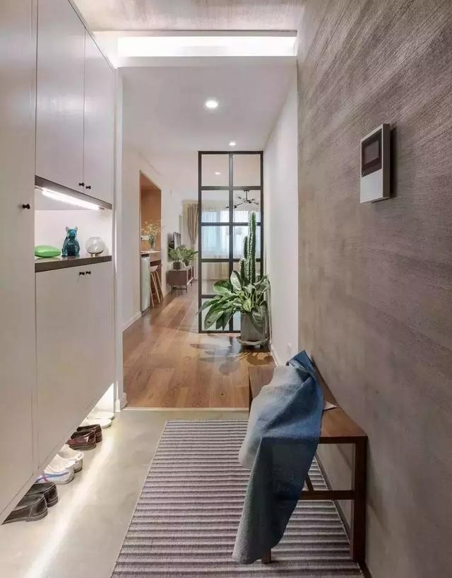 玄关柜的头号功能是存放鞋子,当没有玄关柜的时候,鞋子势必要放在家的各个角落,明显是挤压了房间面积。