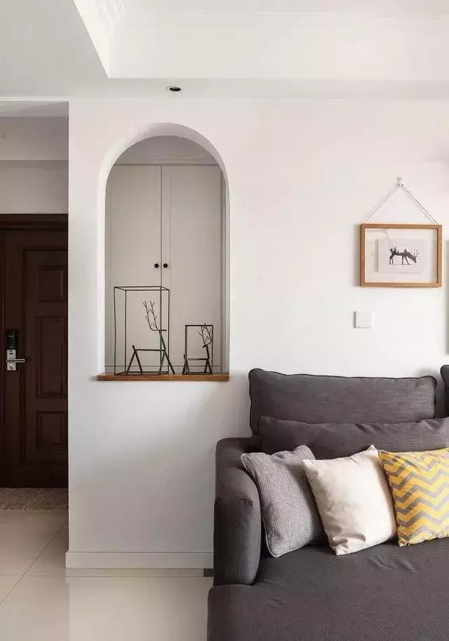 玄关不是独立的空间,在进门左手边打造了一排嵌入式收纳柜,满足日常储物需求。和客厅之间隔了扇拱形假窗,设计还蛮有创意的。