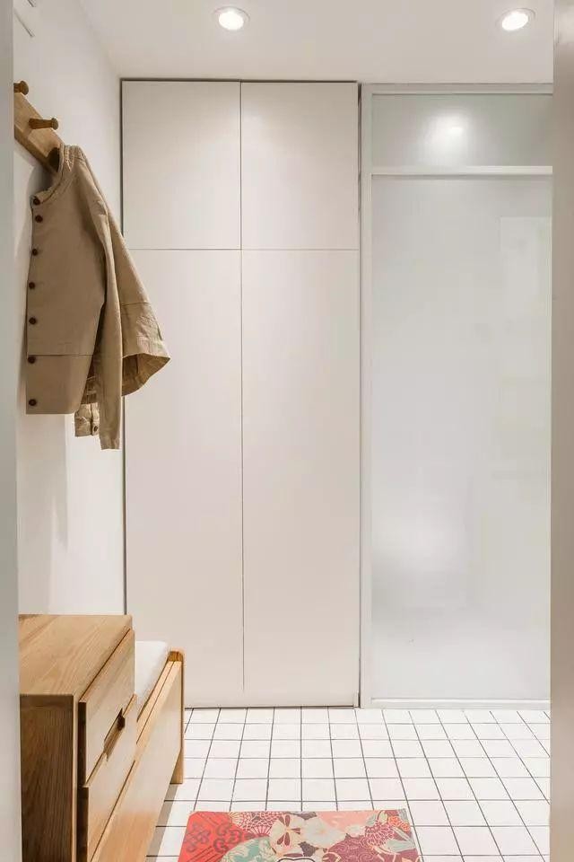 入户玄关处做了一个换鞋凳、挂衣钩和嵌入式的到顶鞋柜,方便日常更换鞋子和增加储物空间,白色为主的设计也缓解了没有采光的问题。