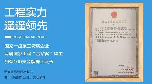 美迪装饰工程品质得到了国家住建部的认可,2016年被国家住建部授予国家一级施工资质,它是家装工程的最高荣誉,拥有该资质的家装企业仅为千分之一。每一道工艺都将经过严格管控,层层把关,才会交付到业主手中,确保工程的高品质和高水准。