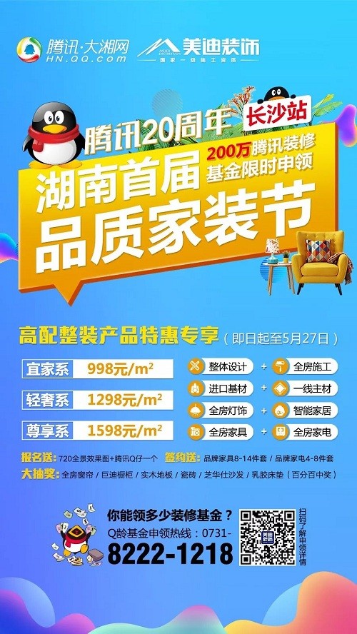 今年,陪伴一代人青春的腾讯QQ迎来了自己的20周年,20岁的腾讯,在互联网的全面布局和发展中,也将曾经虚拟世界的陪伴深入到社会责任中。为感谢广大网友对腾讯湖南的支持与厚爱,解决湖南人装修中遭遇的实际痛点难点,特举办湖南首届品质家装节,为腾讯网友提供装修基金及高品质装修服务。
