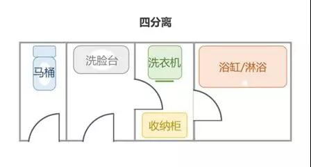 四分离的形式在国内使用的比较少,使用于相对而言户型比较大的空间,这样的分离法让一家人可以同时使用这几个区分开来的不同功能,是一个比较完美的解决方法,但是大家要慎用哦,需要根据自家的户型情况来做最合适的选择,才能收获一个美美的又舒适的家啦。