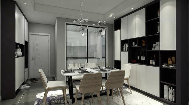 性冷淡风格的餐厅装饰,在搭配上既简单的餐桌椅,高冷范儿立显出来。餐边柜的设计,融入酒柜的元素,可以放置一些红酒,也可以放置一些小摆件。