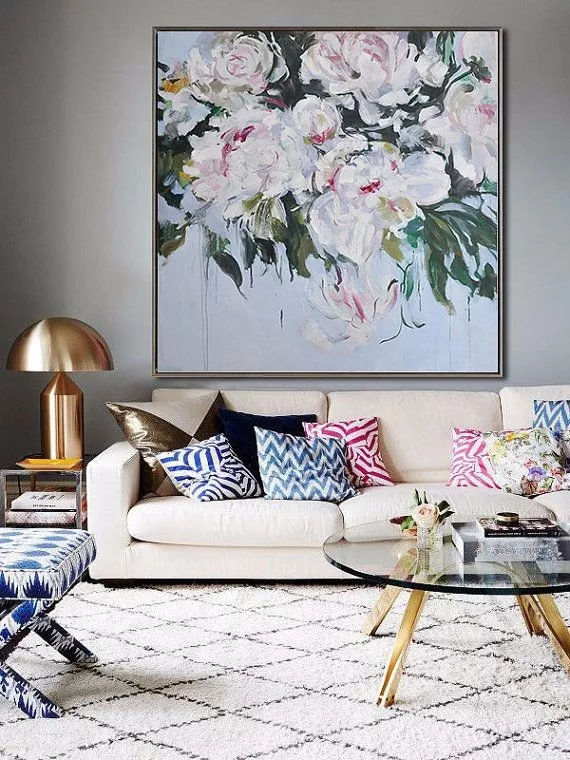很长一段时间,装饰画流行一种用多幅画组合装饰墙面的挂法,或是把中心点集中在同一条线上,把相同尺寸和形状的装饰画进行排列,但 2018 年的新趋势是用单幅大尺寸的画装饰墙面,不管是海报、绘画作品还是摄影作品。