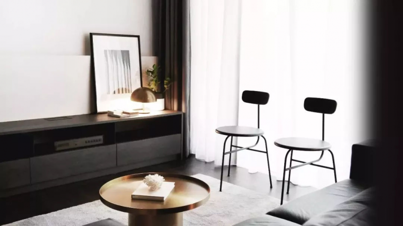 饱和度较低的灰调空间,视觉感受舒适自然,但时间长了会感觉有些乏味无趣,黄铜家具的加入,形成温柔而恬淡的冷暖对比,营造出稳重低调、毫不张扬的空间氛围。