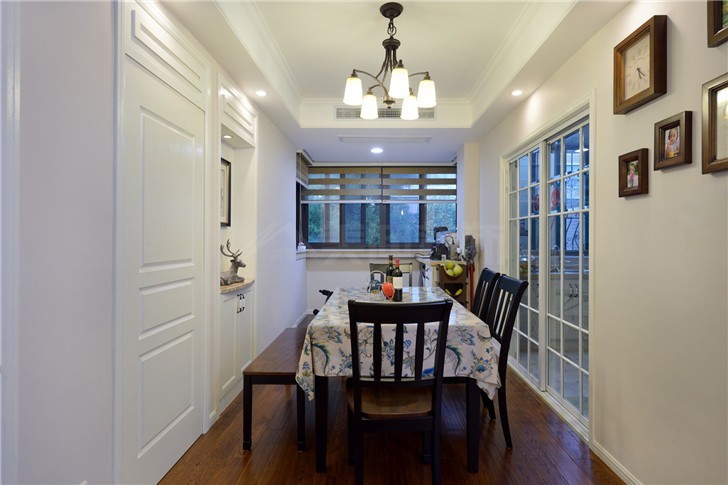餐厅与厨房之间的隔门避免了油烟大面积扩散,整体的白色设计让人心旷神怡,墙面上的相框不仅装饰了整个空间,在用餐之前还可以给客人讲述相册故事,能与他人分享快乐也是一种很好的下饭佐料。