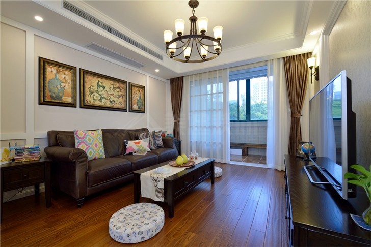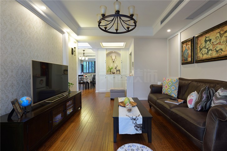 电视柜与茶几之间的过道提供了能充分活动的空间,屋主母亲同时也是一位喜爱动物的女性,这在壁画及摆饰中就能看出。白色的壁柜既符合整体的风格,同时也最大程度的利用了房屋的空间。