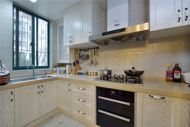厨房是狭长的L型设计,所以选择以浅色系的瓷砖来装饰,油烟机两侧的橱柜不仅能增强厨房的立体感,还给爱做饭的母亲提供了更多的收纳空间。